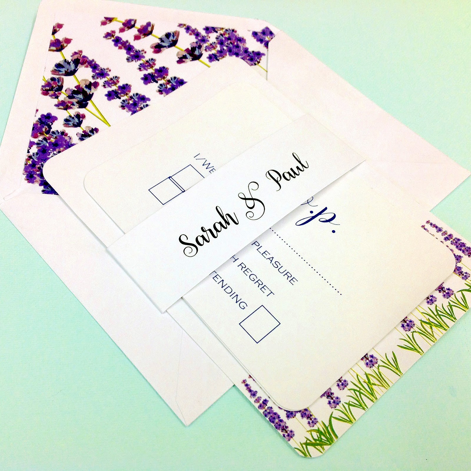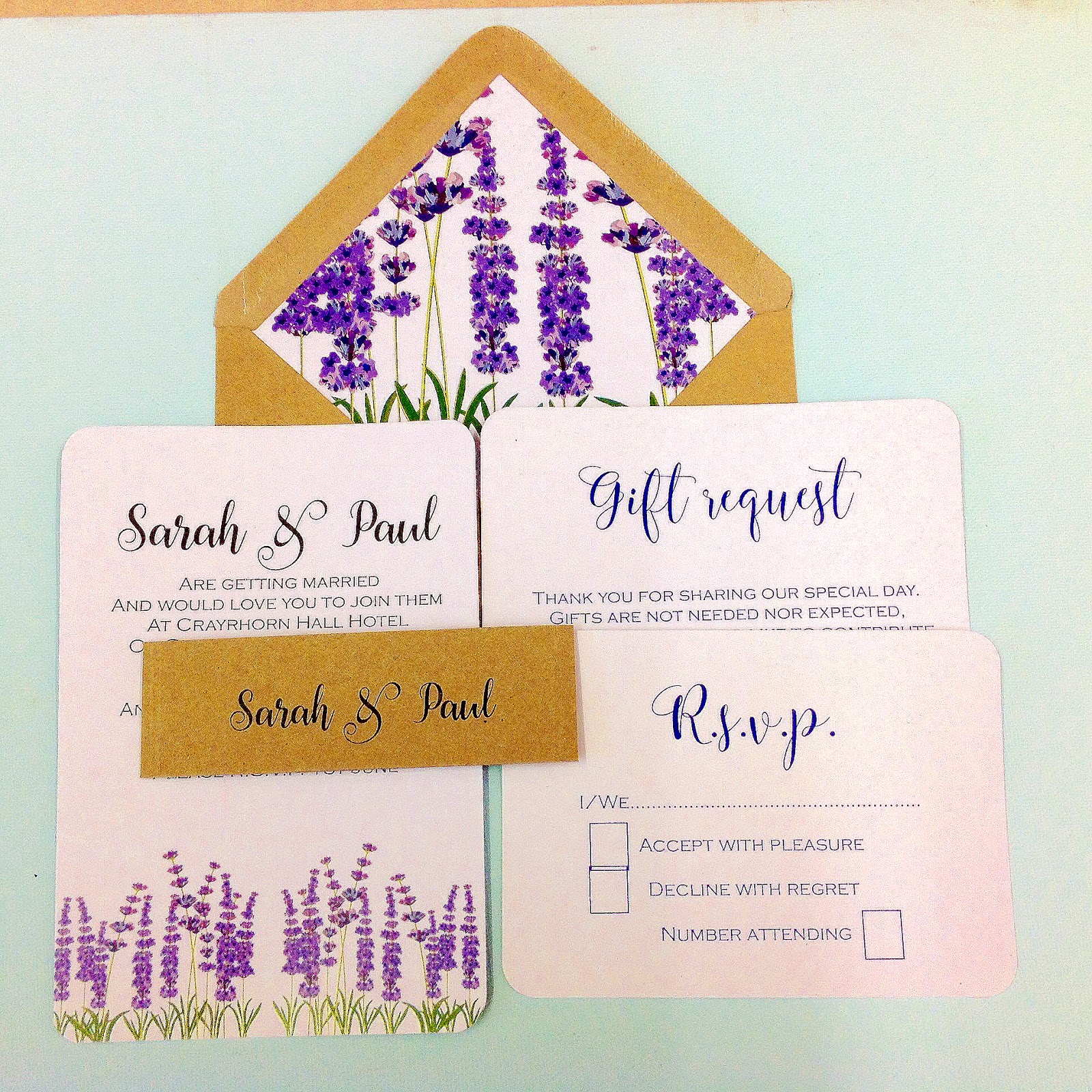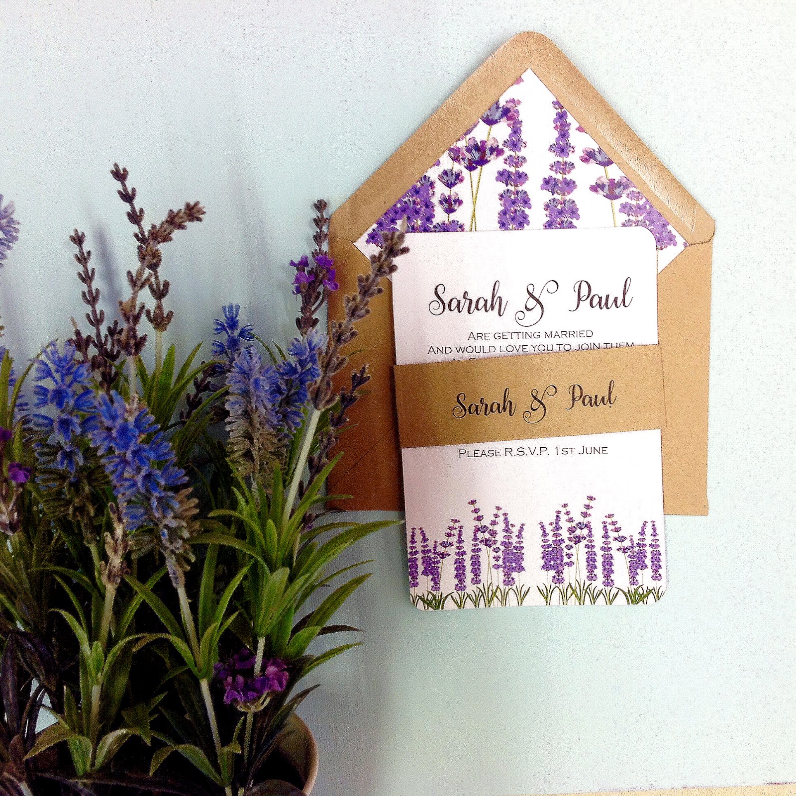 These custom-made Lavenders Blue, dilly, dilly invitations feature stalks of lavender with a purple modern calligraphic font. the Invitation, gift request and R.S.V.P. card are held together with a matching white belly band. Kraft Belly Bands and envelopes are an optional extra.